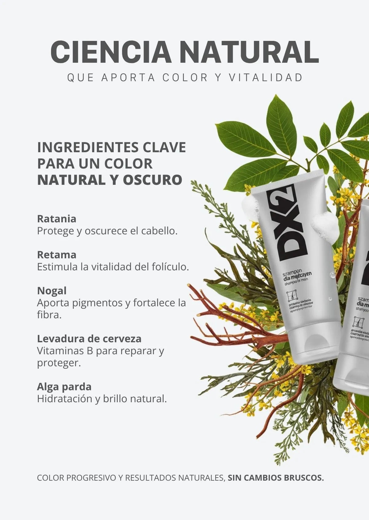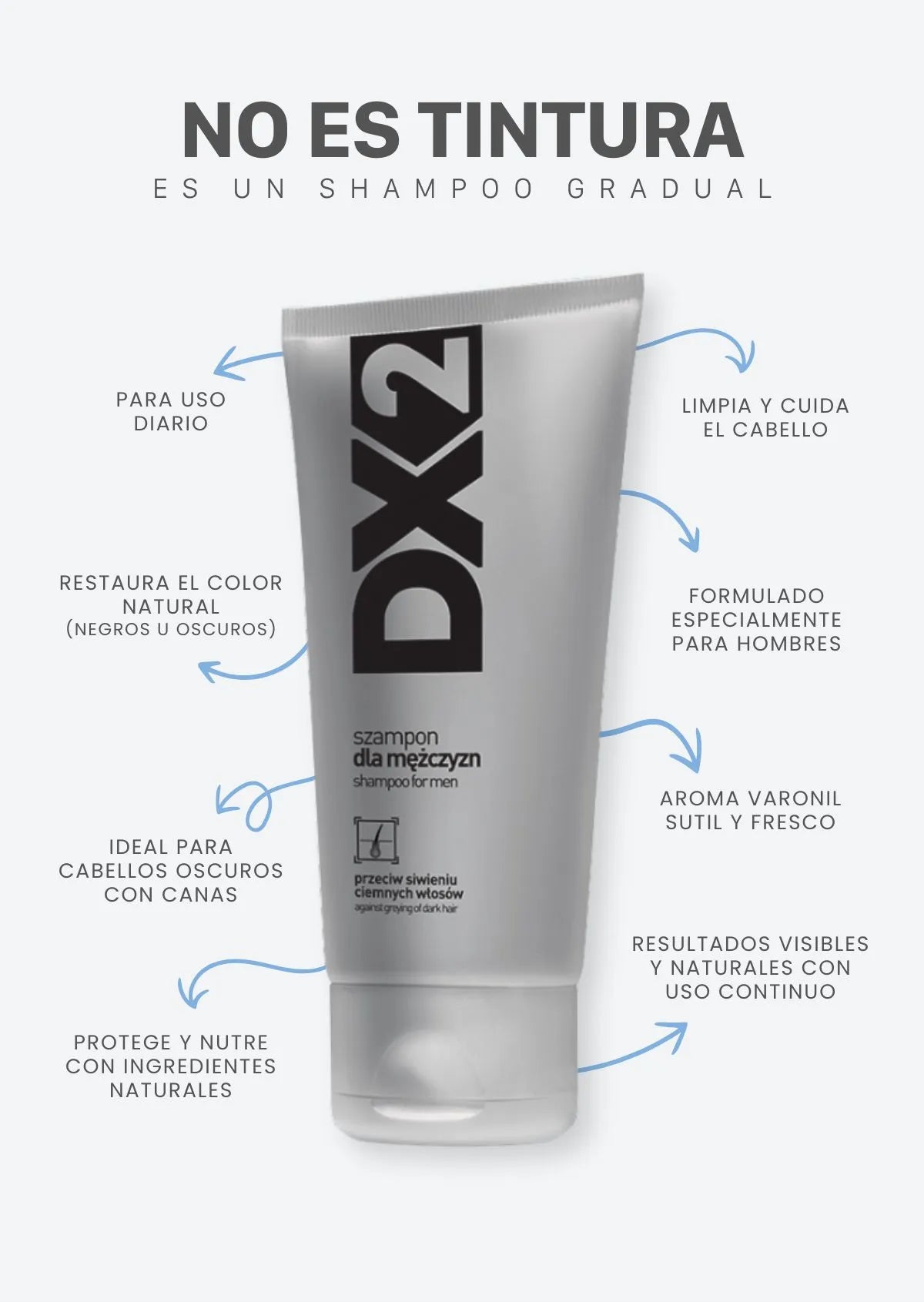 DX2 es un shampoo innovador, con extractos botánicos y antioxidantes que protege la pigmentación natural del cabello. Restaura gradualmente el color oscuro natural del cabello y ayuda a retrasar la progresión de las canas de forma sutil y elegante.