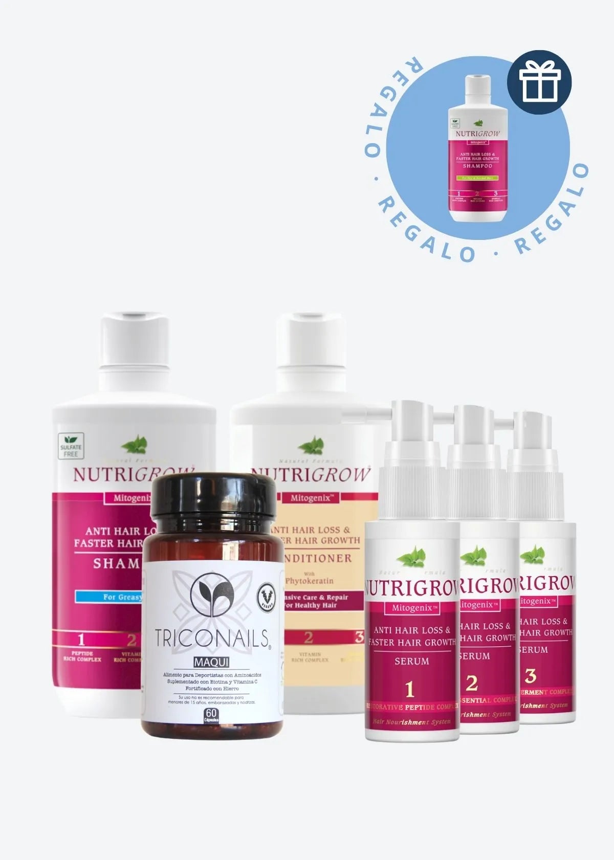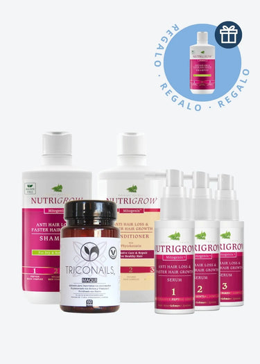 El Pack completo considera: 1 Shampoo 300 ml. + 1 Acondicionador 300 ml. + 1 caja de Serum con 3 botellines de 60 ml. c/u + 1 frasco 60 cápsulas + 🎁 Shampoo Nutrigrow de 300ml para cabello normal a seco de regalo